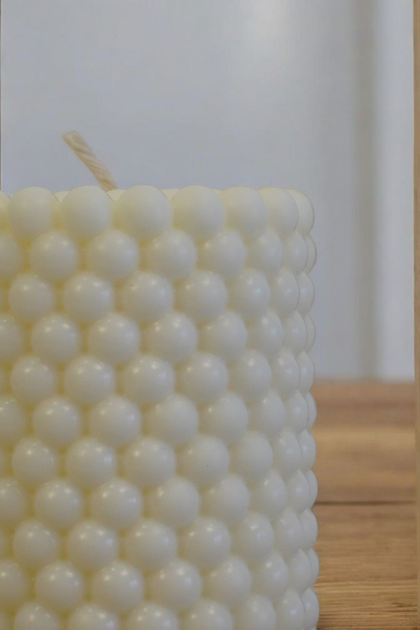 Inspirada en la suavidad y el juego de las formas, esta vela presenta un diseño cilíndrico lleno de burbujas que aporta un toque moderno y divertido a cualquier espacio. Una pieza decorativa perfecta para quienes buscan detalles originales y llenos de personalidad en su hogar.