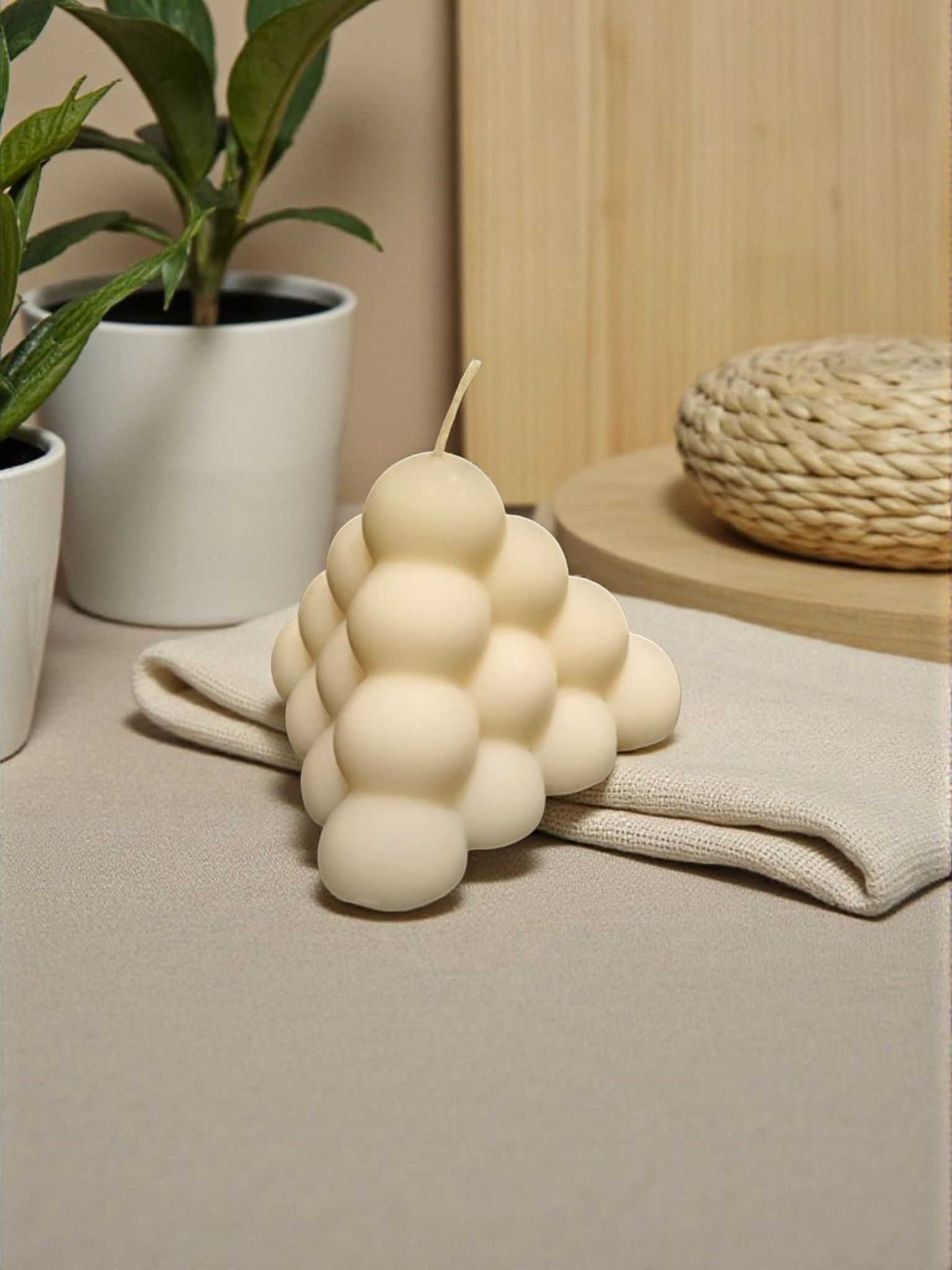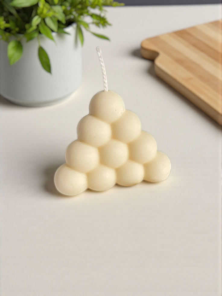 Inspirada en la geometría y la diversión de las formas, esta vela presenta un diseño triangular lleno de burbujas que aporta un toque original y moderno a cualquier espacio. Una pieza decorativa perfecta para quienes buscan detalles únicos y con personalidad en su hogar.