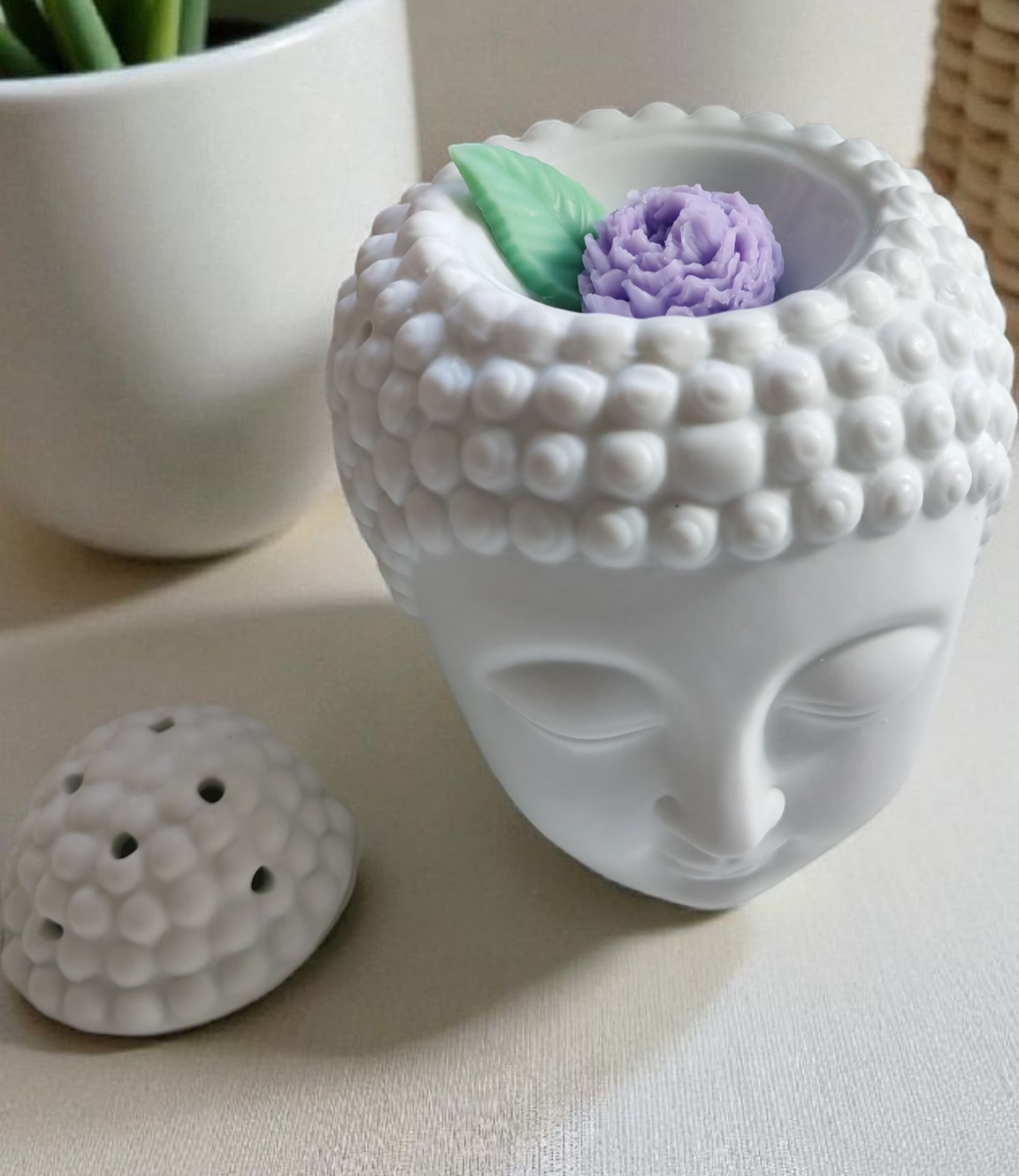 Un quemador de cerámica que combina funcionalidad y serenidad, pensado para crear un rincón de calma y armonía en cualquier espacio. Su forma de cabeza de Buddha transmite tranquilidad y equilibrio, convirtiéndolo en una pieza decorativa que invita a la contemplación y al bienestar.
