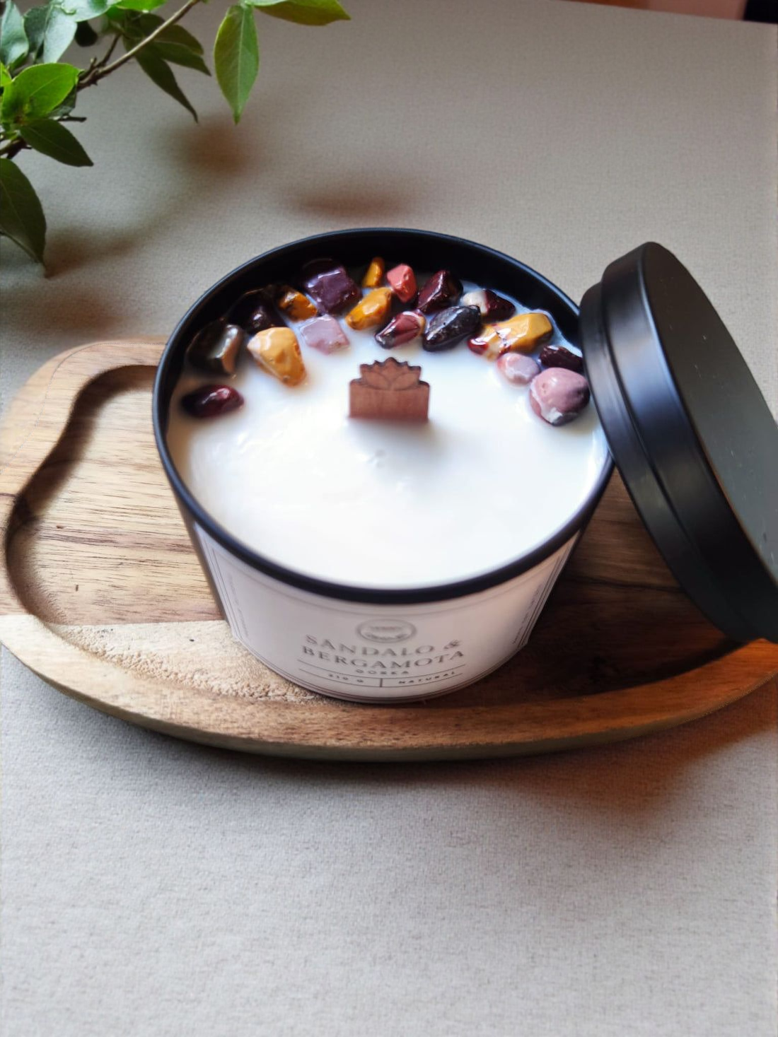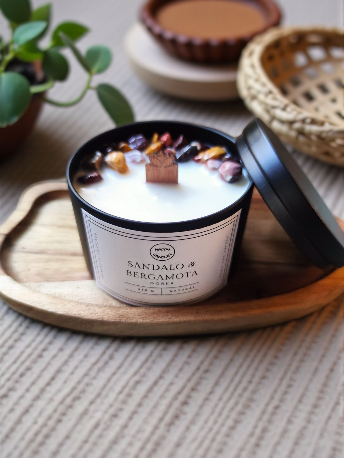 El sándalo, cálido y amaderado, aporta equilibrio y profundidad. Su aroma envolvente evoca calma y elegancia. -