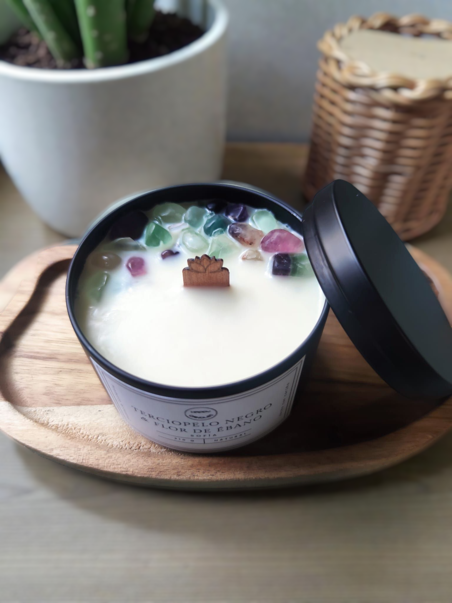 La combinación de terciopelo negro y flor de ébano le da un toque elegante y profundo, creando una atmósfera acogedora, como esas charlas con amigas que te dejan huella. -